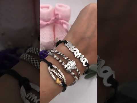 Bracelet en argent rhodié et or avec brillant. Lacet en cuir. Médaille avec la lettre maman. Excellentes finitions, conçues et fabriquées en Espagne.