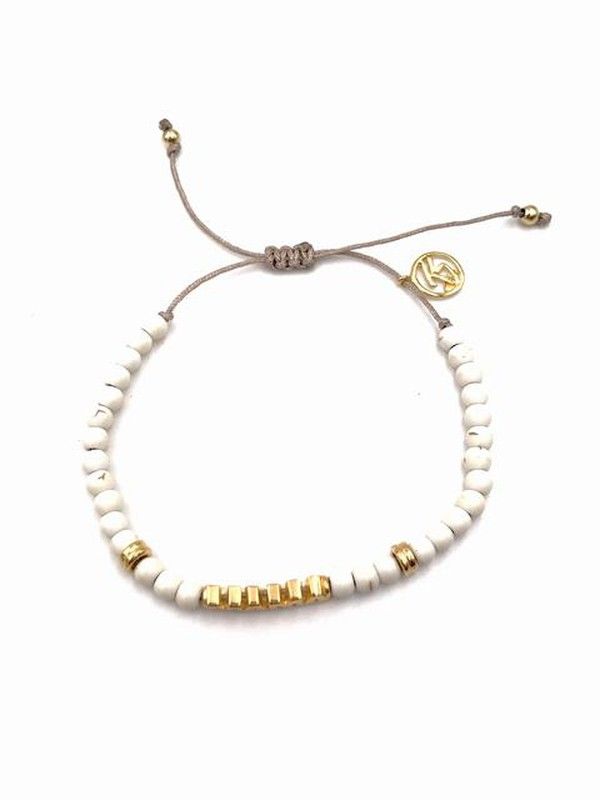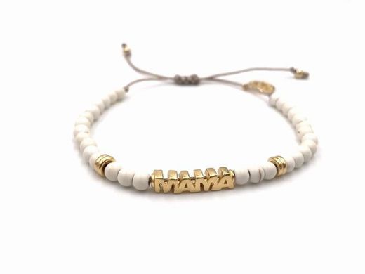 Bracelet en argent sterling plaqué or avec le mot « Mama » gravé et des pierres naturelles blanches. Fabriqué à la main et modifiable sous réserve de disponibilité. Excellente finition.