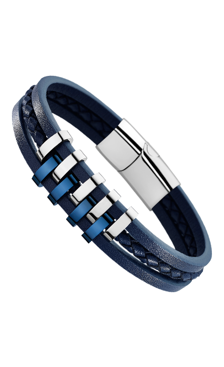 Bracelet en acier inoxydable bleu IP avec trois lanières de cuir, référence LS1838/2/2. Gravure disponible sans supplément et sans délai de livraison. La gravure est apposée sur la partie en acier pour une meilleure visibilité.