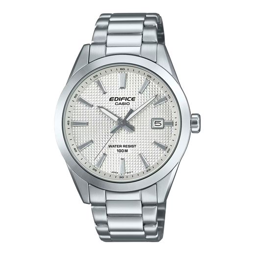 Montre Casio Edifice en acier inoxydable avec cadran argenté, aiguilles et index luminescents. Un garde-temps simple et fonctionnel au cadran texturé. Affichage de la date à 3 heures.