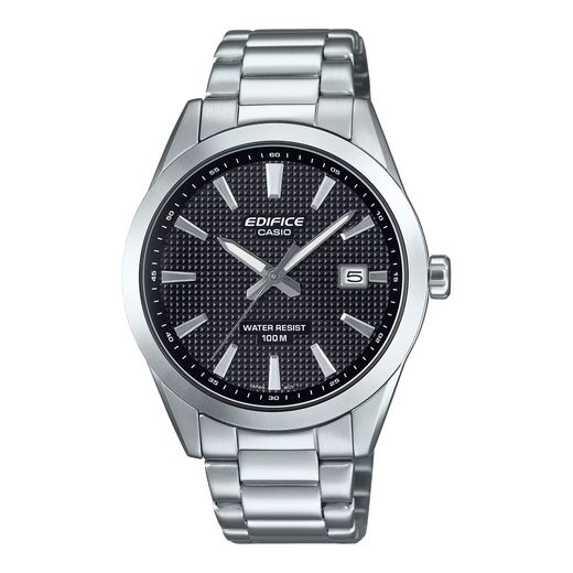 Montre Casio Edifice en acier inoxydable avec cadran noir, aiguilles et index luminescents. Un garde-temps simple et fonctionnel au cadran texturé. Affichage de la date à 3 heures.