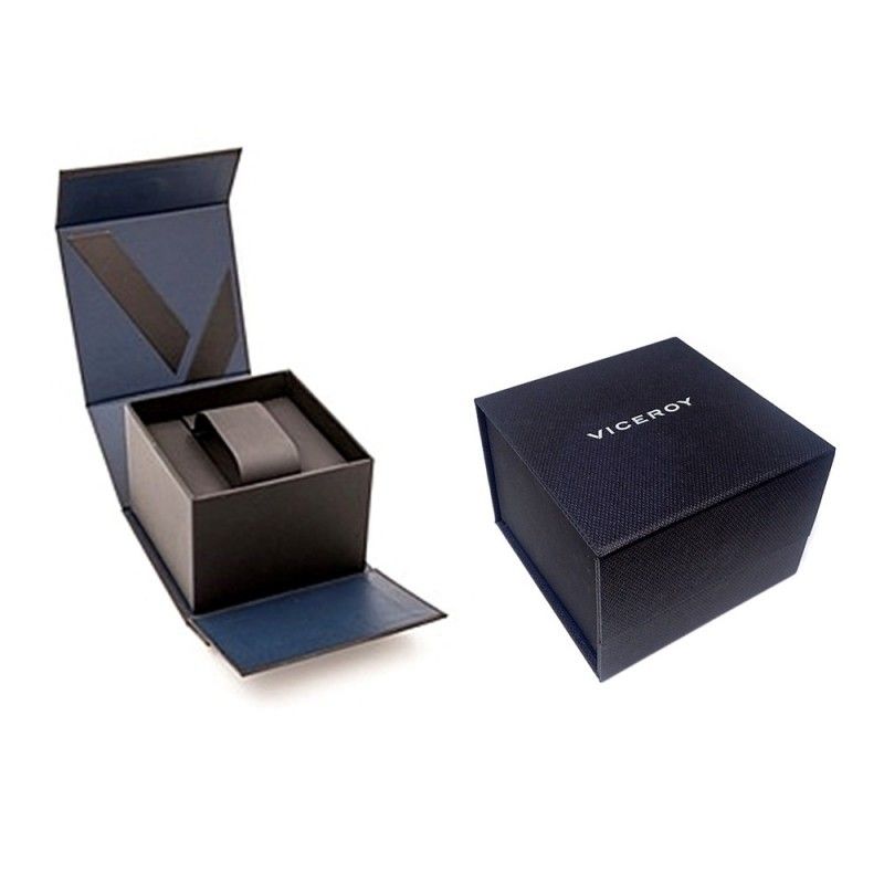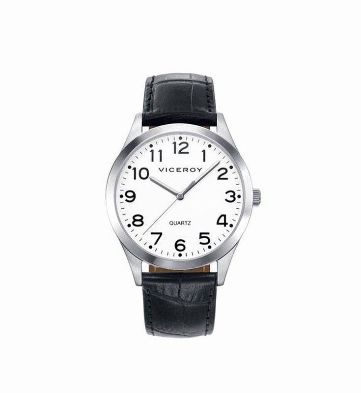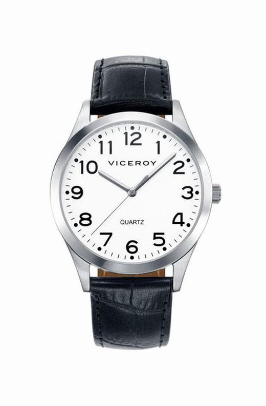 Montre pour homme Viceroy avec boîtier en acier et bracelet en cuir noir lisse. Un classique avec un cadran très clair et tous les chiffres en noir.