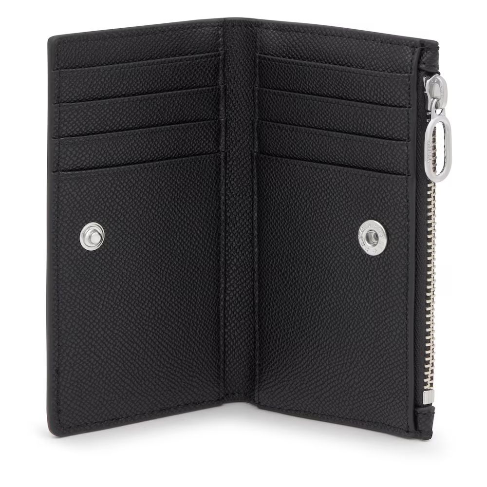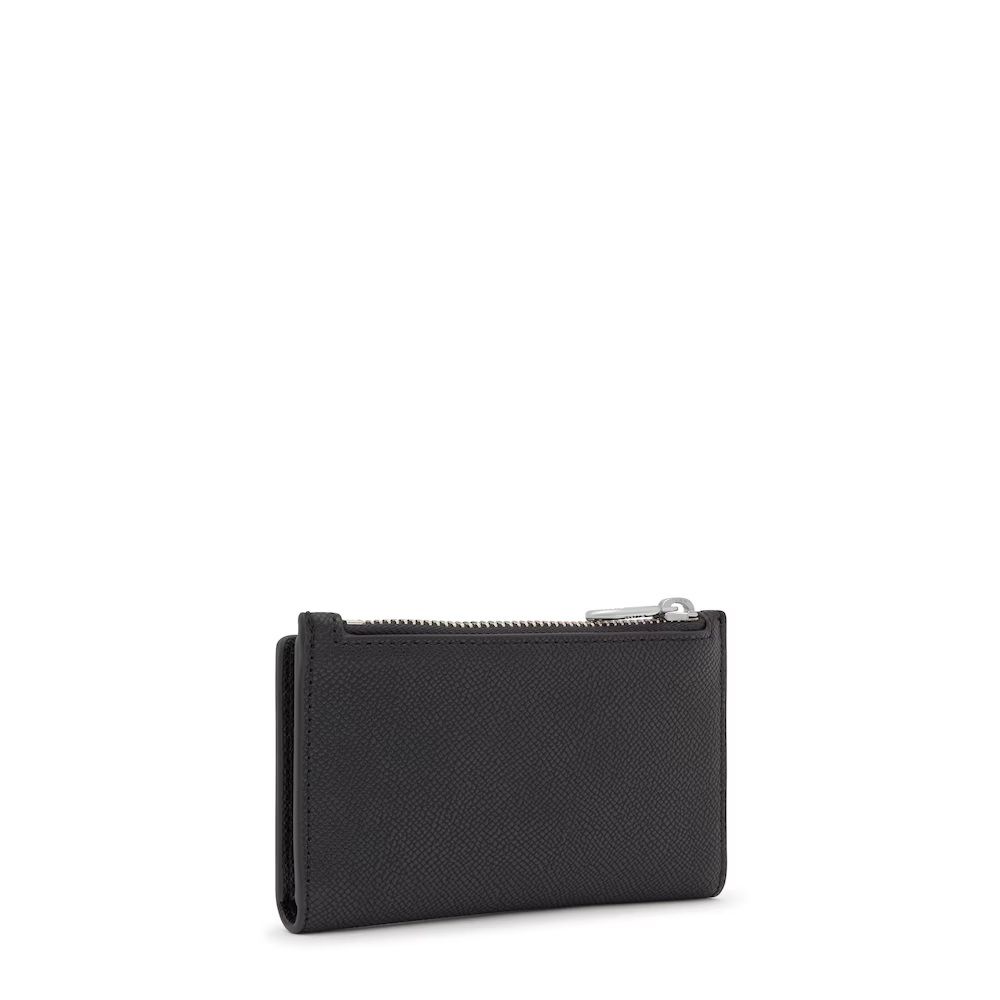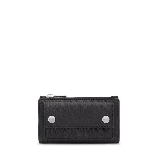 Portefeuille Tous de la collection Audree Pockets, en polyuréthane noir. Un côté se ferme par un bouton-pression et comprend huit emplacements pour cartes et deux compartiments pour billets. L'autre côté se ferme par une fermeture éclair pour la monnaie. Ce modèle est également doté d'une poche extérieure à bouton-pression pour un accès facile aux petits objets.
