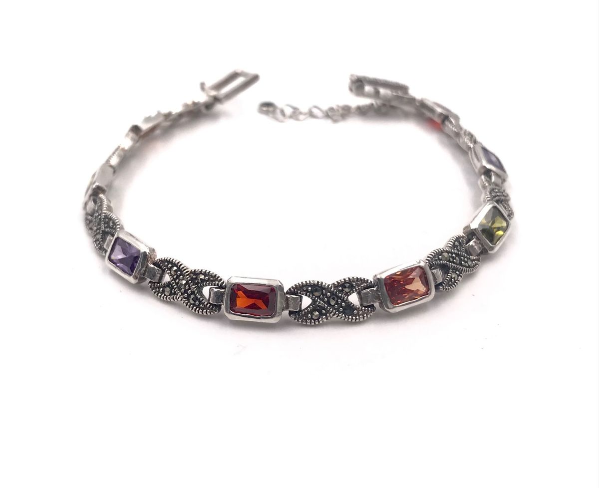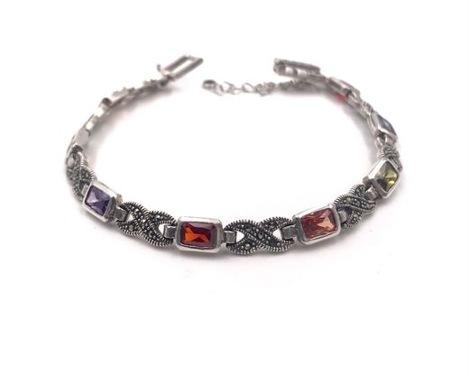 Pulsera fabricada en plata de ley, envejecida, con marquesitas acompañada de circonitas de color, en líneas rectas y circonitas embatadas. Un aire vintage muy sutil, para las amantes de las colores. Un pulsera elegante para la mujer de hoy en día.
