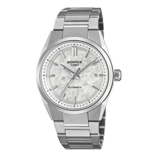 Reloj Casio Edifice Automático, fabricado en acero inoxidable con esfera en color blanco nacarado efecto agua, un reloj de alta gama dentro de la colección. El diseño deportivo pero refinado del reloj presenta una caja delgada y compacta de tan sólo 38 mm y una esfera con una textura elaborada con técnica especial de electroformado. El cristal de zafiro de alta transparencia y resistente a las rayaduras ofrece una visibilidad clara, mientras que los índices en relieve, así como el bisel y la caja afilados, completan un diseño dinámico a la par que sofisticado. Movimiento automático fabricado en Japón, ofrece una reserva de marcha de unas 42 horas. Con un fondo de caja transparente que revela el meticuloso movimiento del mecanismo, comprenderá realmente el atractivo único de un reloj mecánico. Todo tipo de detalles muy cuidados aportando una calidad premium a este espectacular reloj.