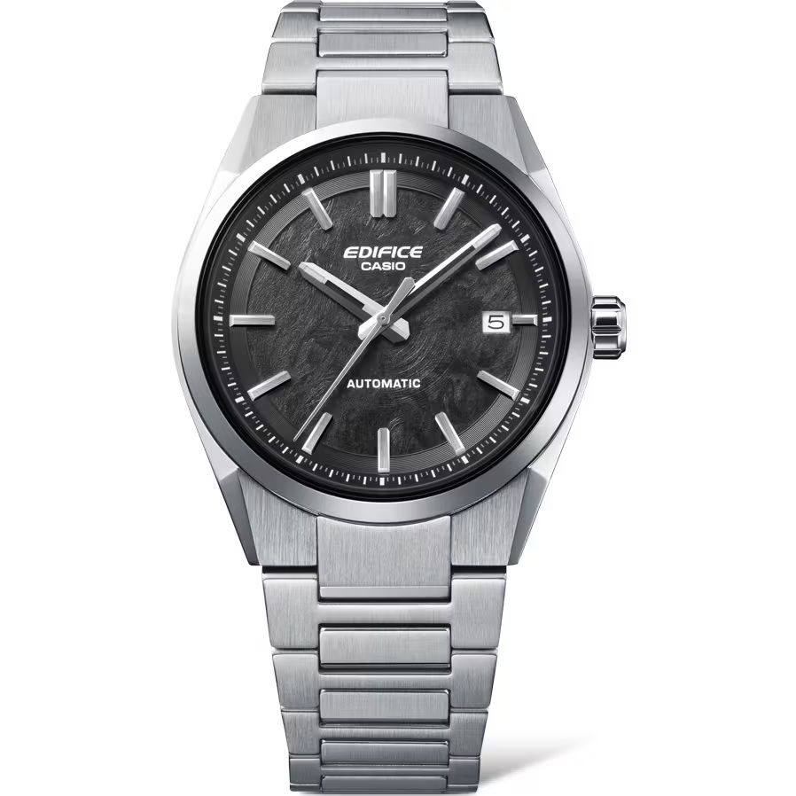 Reloj Casio Edifice Automático, fabricado en acero inoxidable con esfera en color negro, un reloj de alta gama dentro de la colección. El diseño deportivo pero refinado del reloj presenta una caja delgada y compacta de tan sólo 38 mm y una esfera con una textura elaborada con técnica especial de electroformado. El cristal de zafiro de alta transparencia y resistente a las rayaduras ofrece una visibilidad clara, mientras que los índices en relieve, así como el bisel y la caja afilados, completan un diseño dinámico a la par que sofisticado. Movimiento automático fabricado en Japón, ofrece una reserva de marcha de unas 42 horas. Con un fondo de caja transparente que revela el meticuloso movimiento del mecanismo, comprenderá realmente el atractivo único de un reloj mecánico. Todo tipo de detalles muy cuidados aportando una calidad premium a este espectacular reloj.