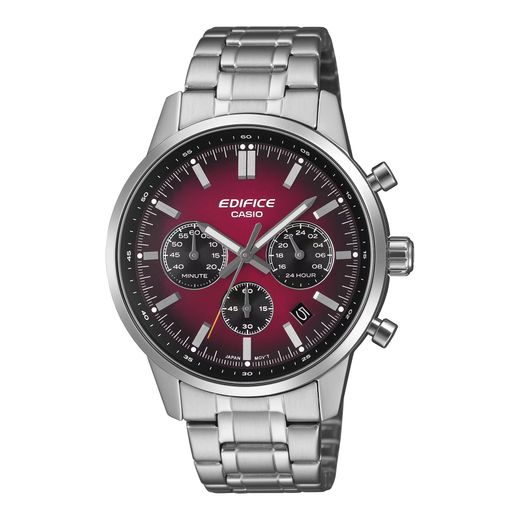 Reloj Casio de la línea Edifice, fabricado en caja y brazalete de acero, con esfera degradada de rojo a negro, maquinaria cronógrafo. Este modelo está inspirado en los indicadores de cristal convexo de los deportivos clásicos, un estilo tradicional. La esfera bicolor cuenta con colores entre la esfera principal y las zonas contrastadas, dando el aspecto de un panel de instrumentos de un deportivo clásico.