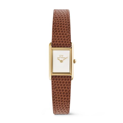 Reloj Daniel Wellington, fabricado en acero inoxidable Ip dorado, de la colección Bound, con correa de piel texturizada en color marrón. Una versión compacta del reloj rectangular, con caja delgada y una esfera blanca impecable se combinan con una correa de malla dorada para un look moderno y desenfadado.