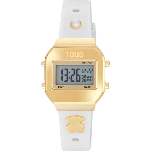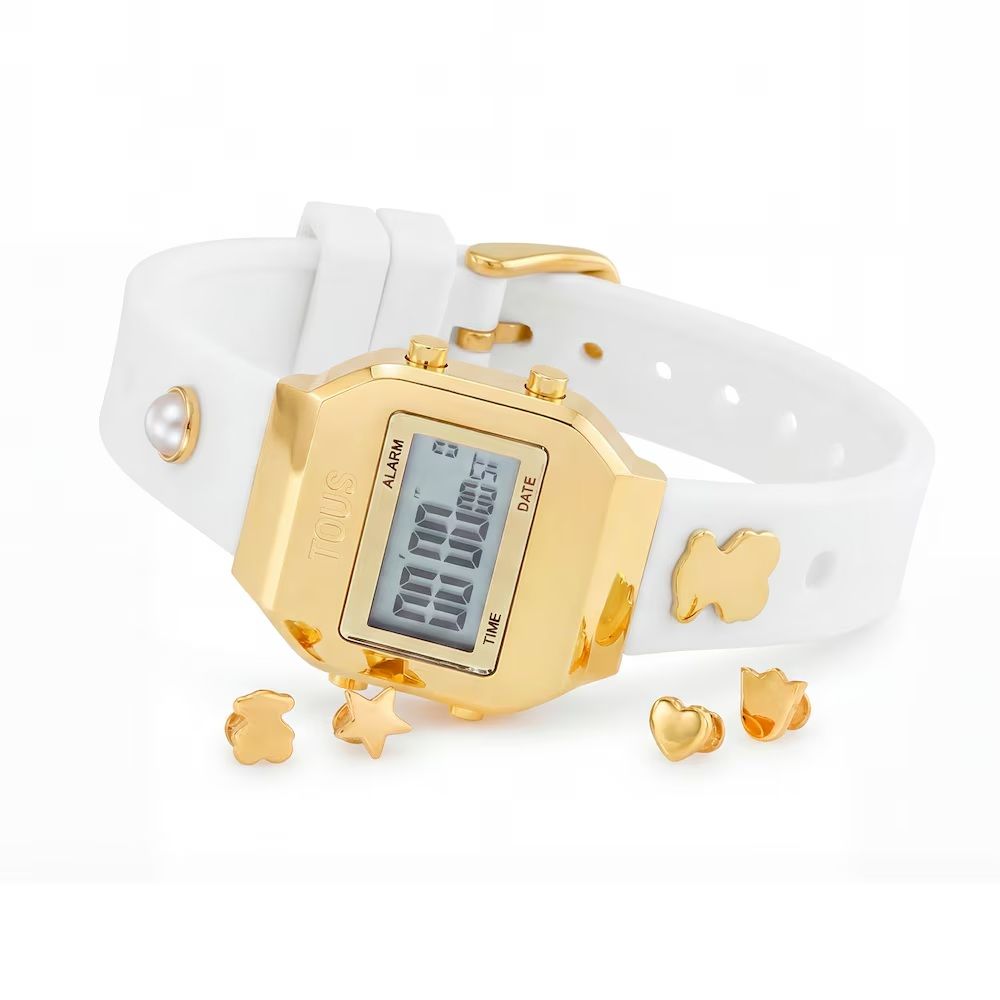 Reloj Tous de la coleccion TO XPRESurSLF, fabricado en acero inoxidable Ip dorado, con brazalete de silicona blanca. Un brazalete divertido en el cual puedes variar cada dia su aspecto gracias a sus cuatro charms intercambiables. Un tamaño reducido que lo hace válido tanto para niña como para mujer.