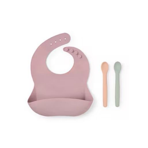 Set de Babero y dos cucharas Tous, de la colección Food Kit, fabricado con silicona alimentaria en color rosa. Un conjunto ideal para pasar del biberón a sus primeras papillas. El babero es de un tacto suave y aterciopelado, el cual evitará que el bebe se manche durante las comidas gracias a su bolsillo frontal, que recogerá toda la comida que pueda caer. Las cucharas tienen un mango flexible consiguiendo así un ángulo ideal para ayudarte o incluso a cuando el bebé comience a comer solito.